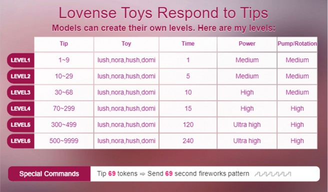 - Pour les As: si je tire un As et que le joueur gagne, j'insère un plug anal relatif à la carte (exemple: un plug anal trèfle si le joueur tire un trèfle). Si je gagne en tirant un As, le joueur tip un montant de 69 jetons, ce qui me fera vibrer pendant 69 secondes en mode spécial Feux d'Artifice.